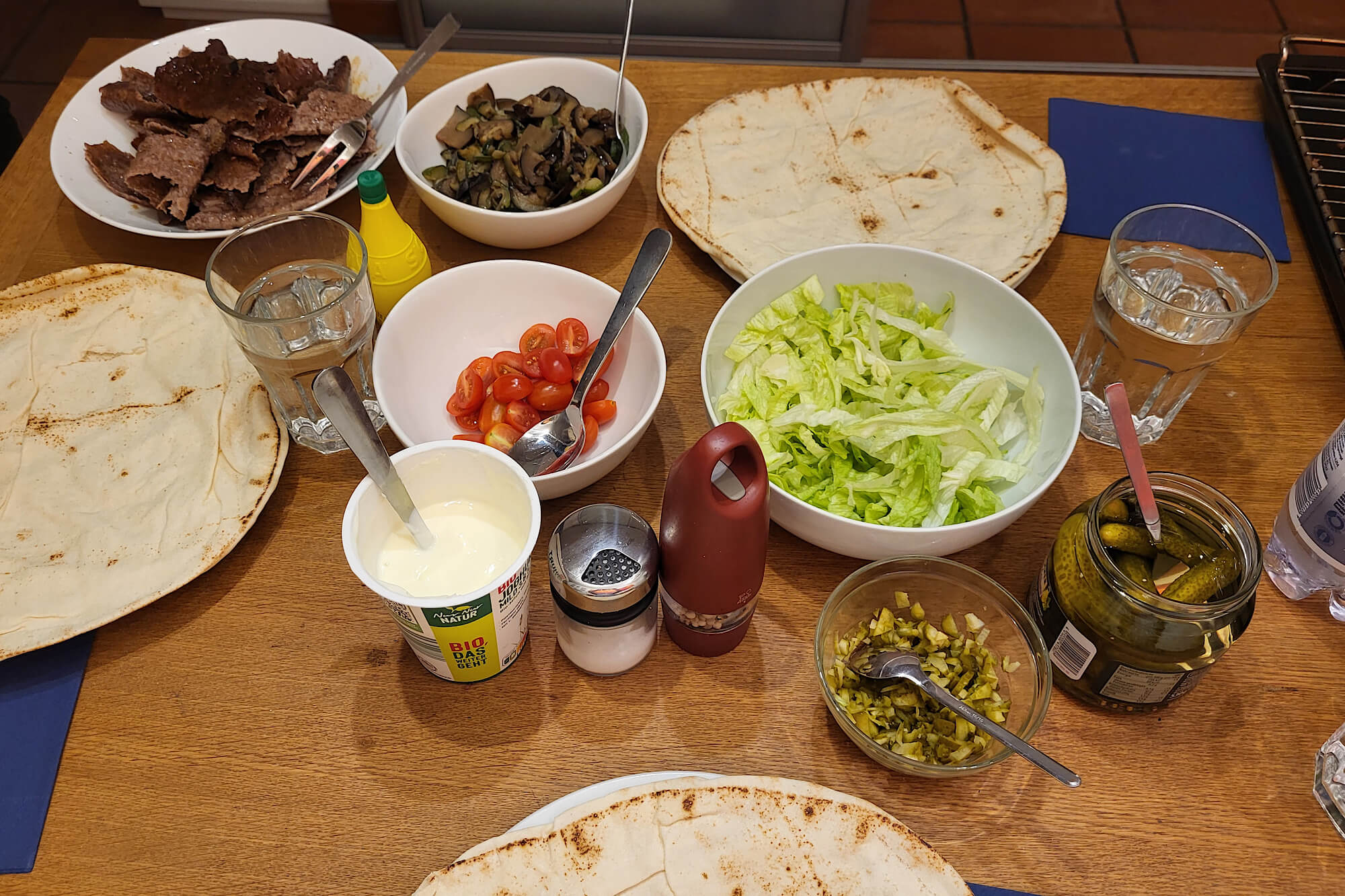 Die Fleischstückchen (links hinten im Bild) gibt man dann mit Joghuft, gebratenem Gemüse, Salat, Tomaten, Gurken auf die Fladenbrote und rollt diese zusammen: