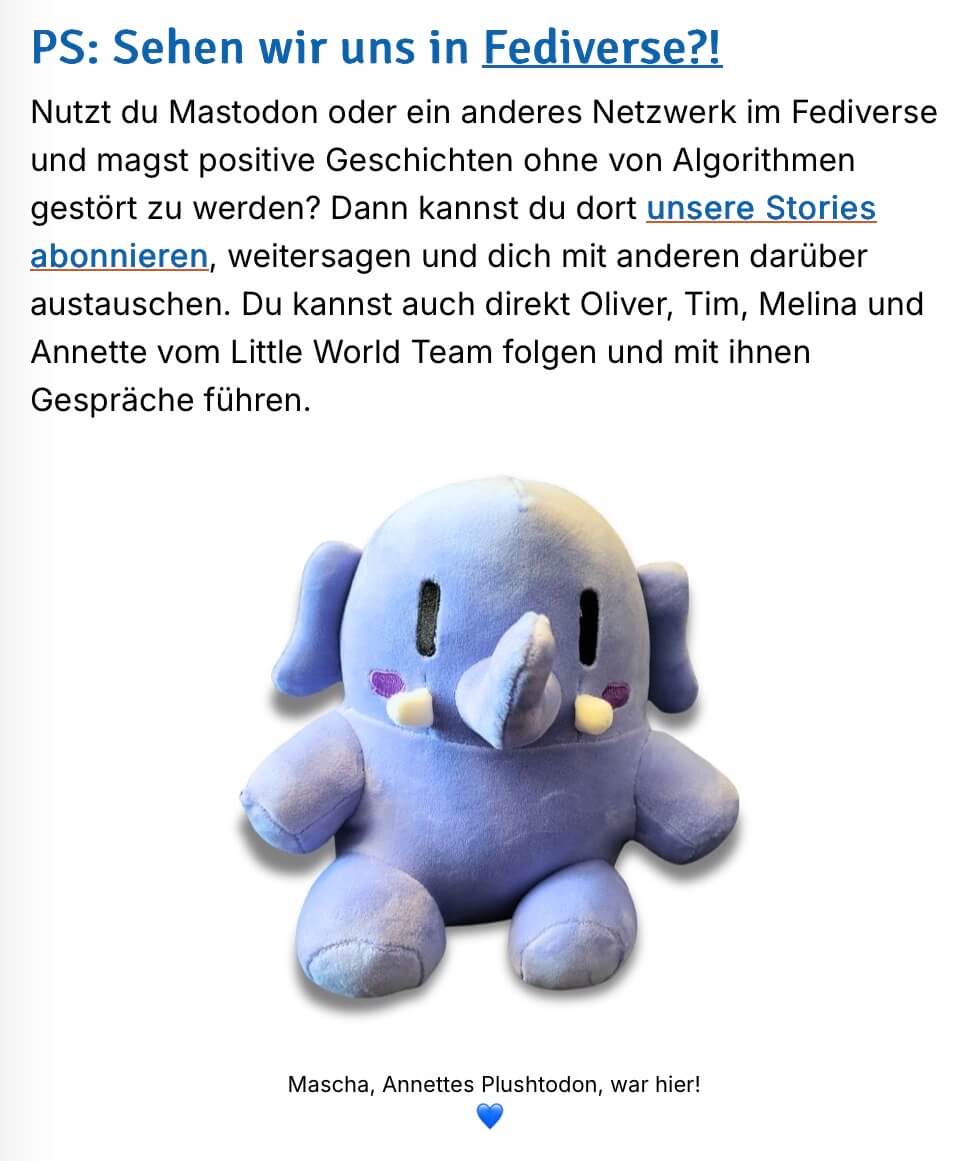 Gestern hatte außerdem mein Plushtodon Mascha die Ehre, im Newsletter auf die Mastodon-Accounts von Little World hinzuweisen: